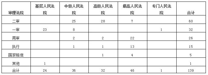 从审理法院的级别来看,同样涉及四级法院。其中应用案例数量在30例以上的以中级人民法院居多,包括广东省东莞市中级人民法院等11家法院;最高人民法院有43例;高级人民法院包括广东省和四川省高级人民法院,分别有47例和41例。基层人民法院包括河南省宁陵县人民法院,北京市西城区、大兴区人民法院及广东省深圳市罗湖区人民法院4家,分别有69例、49例、30例和30例。