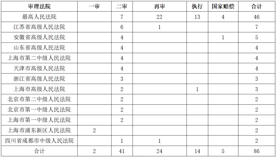 遴选出2例以上指导性案例的来源法院共计13家,涉及二审案例41例,再审24例,执行14例,国家赔偿5例,一审2例。其中二审案例含最高人民法院在内的12家法院,具体包括浙江省、江苏省、安徽省、山东省、天津市、上海市高级人民法院;上海市第一、二中级人民法院,北京市第一、二中级人民法院,四川省成都市中级人民法院。再审案例包括最高人民法院、江苏省高级人民法院及四川省成都市中级人民法院;执行案例包括最高人民法院及上海市高级人民法院;国家赔偿案例有最高人民法院和安徽省高级人民法院;一审案例仅有上海市浦东新区人民法院。