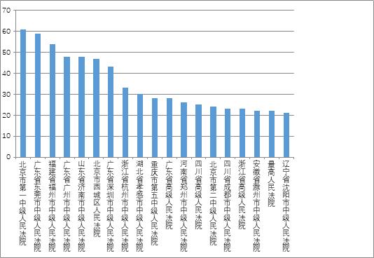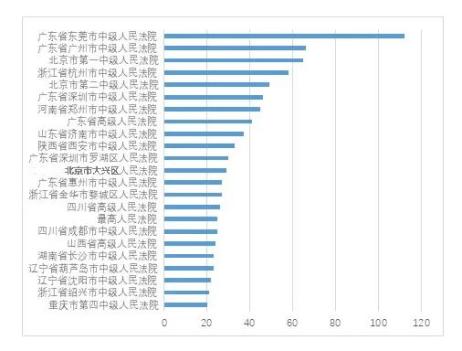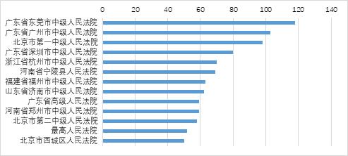 从应用案例的具体审理法院来看,数量在50例以上的有13家法院,其中前三位的是广东省东莞市、广州市中级人民法院和北京市第一中级人民法院,分别有118例、103例、98例;应用案例数量在50至80例之间,有广东省深圳市中级人民法院、浙江省杭州市中级人民法院、河南省宁陵县人民法院等10家法院。