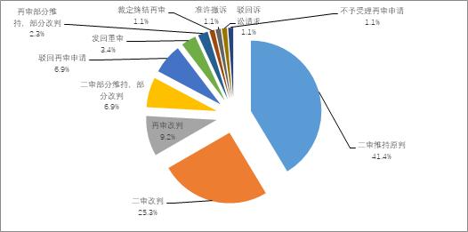在终审结果涉及二审和再审程序的指导性案例中,二审维持原判的占比约41%,较2018年(44%)下降了3%;二审改判的占比约25%,较2018年(19%)提高了6%;再审改判的占比约9%;二审部分维持、部分改判,驳回再审申请、发回重审和再审部分维持、部分改判的占比分别约为7%、7%、3%、2%;准许撤诉、驳回诉讼请求、不予受理再审申请的总占比约为6%。