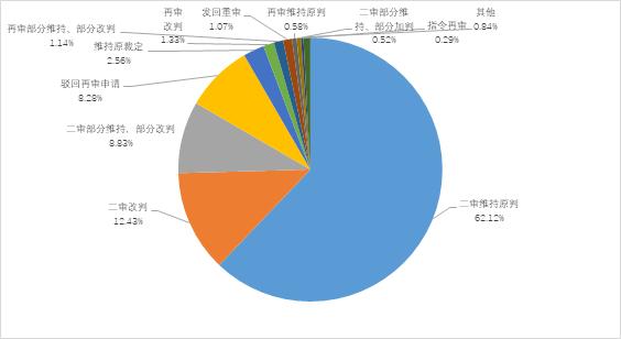 应用案例中,二审维持原判的占比约62%,比2018年(66%)下降了4%;二审改判的占比约12%,较2018年(13%)下降了1%;二审部分维持、部分改判的约占9%;驳回再审申请的占比约为8%;维持原裁定占比约为3%,再审改判,再审部分维持、部分改判,再审维持原判,二审部分维持、部分加判,指令再审等占比约6%。