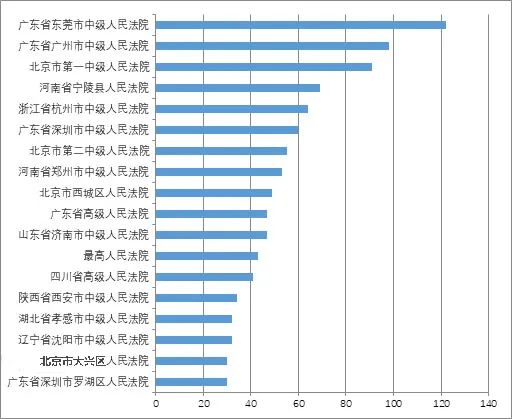 从审理法院的地域分布来看,以广东省、北京市、河南省、浙江省及山东省居多。从具体审理法院来看,数量在30例以上的审理法院包括广东省东莞市中级人民法院等18家法院。其中前三位的是广东省东莞市、广州市中级人民法院及北京市第一中级人民法院,分别有122例、98例和91例。应用案例数量在50至80例之间的,有河南省宁陵县人民法院、浙江省杭州市中级人民法院、广东省深圳市中级人民法院、河南省郑州市中级人民法院和北京市第二中级人民法院5家法院;应用案例数量在30至50例之间的,有北京市西城区人民法院等10家法院。