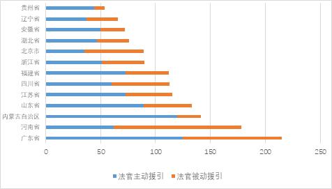 法官主动援引的应用案例在100例以上的有广东省和内蒙古自治区,分别有125例和120例。50至100例的有山东省、江苏省、福建省、河南省、四川省、浙江省、安徽省7个省级行政区域。30至50例之间的有湖北省、贵州省、辽宁省、北京市4个省级行政区域。
