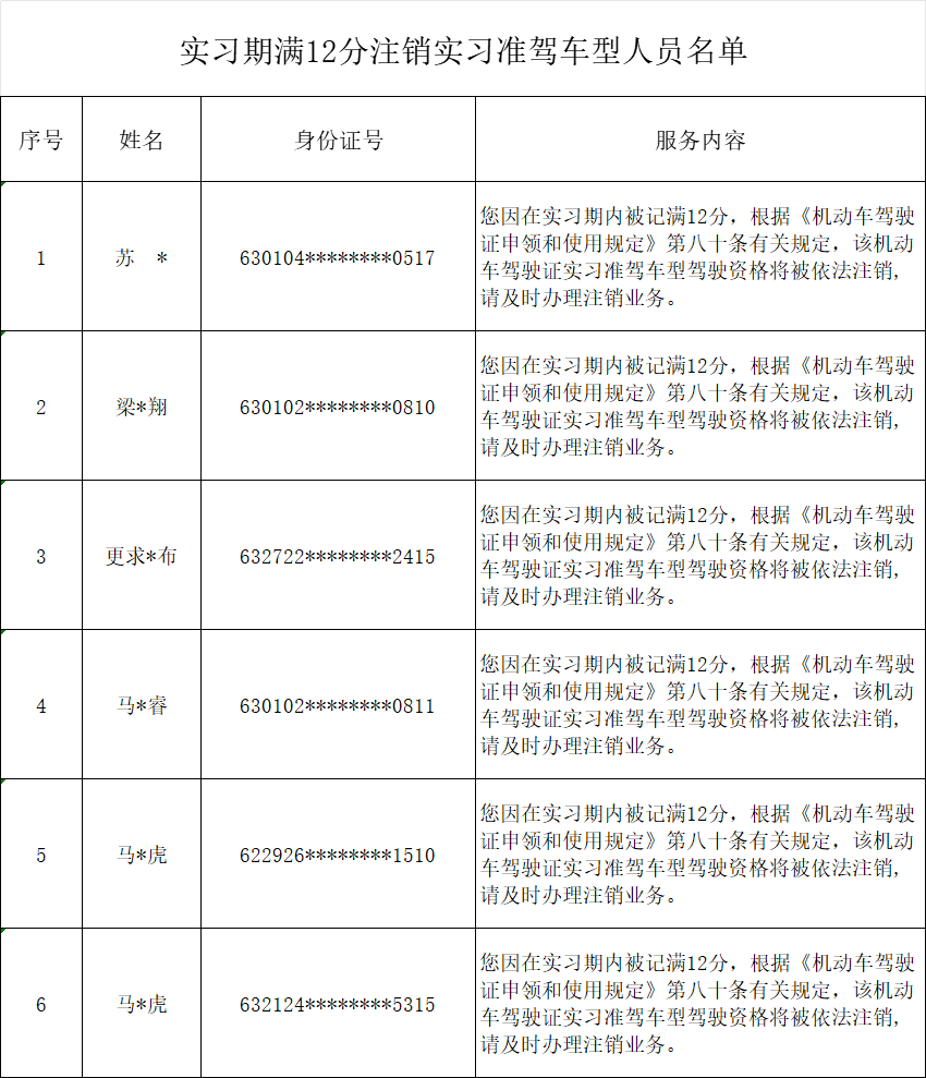 根据《机动车驾驶证申领和使用规定》,机动车驾驶人在实习期内发生的道路交通安全违法行为被记满12分的,注销其实习的准驾车型驾驶资格。现注销以下驾驶人机动车驾驶证实习准驾车型驾驶资格,并公告其机动车驾驶证或实习准驾车型作废。